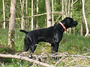 One morning a week or two later, I took my American import German Shorthaired Pointer, Karl, up to the Forestry Commission woods by Wych Lodge Lake with a couple of puppies aged about 12 weeks old, for their first walk in the woods with their grandsire. Having gone on to the end of the main track past the Lake, I thought I had gone a bit far for such youngsters and turned round to retrace my steps. Right in front of us, only 75m or so away, was a big black animal, about the size of the big GSD Police Dogs we would meet up there. I was a bit anxious and thought it might, indeed, be a new solid black GSD Police dog, but could not see anyone with it, let alone another dog. We kept on going slowly towards it, and it looked at us, and I stopped, put the pups on the lead and waited for the owner, not being sure what sort of dog it was – and how nice or otherwise. It then turned sideways on and I started to analyse its conformation: very deep, strong chest, sloping topline, fantastic hindquarter angulation and bone, long tail, very prominent withers, shortish strong neck and smallish head with flattish downface and pricked ears. Definitely not a GSD, nor the Gordon Setters we used to meet in the wood – it did not seem to be any breed of dog I recognised, so perhaps it was not a dog! It then quietly slunk into the undergrowth beside the track and disappeared from view, so we walked back on the track and I asked the pups and Karl "what was it?" They seemed very interested in the scent of the animal.