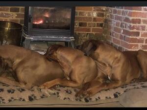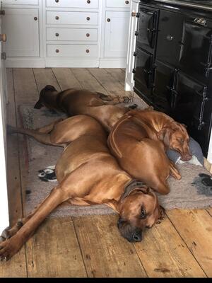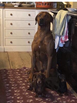 We also have 2 miniature short haired dachshunds (mother & daughter) & my late Father’s Labrador, Annie. Truffle (our dachshund bitch) is a sweetheart. Tadpole, her daughter, is a huge character, she loves everyone, particularly children & she and the ridgebacks are stars as therapy dogs.