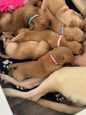 Honey is our beautiful, KC yellow Labrador, our family dog. She is very calm and has a fantastic temperament, who is amazing with children, being raised around our children since she was a little puppy. She is in perfect health condition. Honey has had perfect scans, all puppies are doing really well and strong heart beats in every single one of them. Honey carries the fox red shade of yellow gene and we are expecting dark shade of fox red shade of yellow. Honey has also had training to be our SEN dog for my beautiful daughter with additional needs.