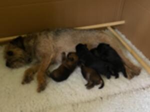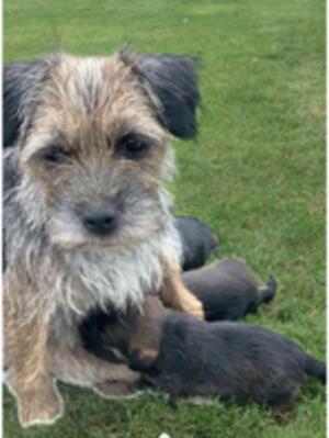 Dan and I are both from farming families. Neither of us can remember a time without at least one dog in the house. Lots of labradors, we decided to buy a Border for our son Edward's seventh birthday. Seventeen years on no one in the family can imagine life without a couple of Border Terriers. Squidge (Ruby Blue) is for me probably that one dog you find in a lifetime. We had one litter from her and kept Pebble. We are now breeding from Pebble for one reason only, to continue this fantastic line of loyal, friendly terriers and our son will be keeping the bitch.