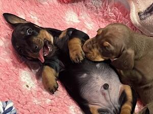Owner : Holidaydax Miniature Dachshunds Breed : Miniature Smooth Haired Dachshund Location : Coventry, Warks Birthdate : 26th December 2018 Colour : Silver Dapple & Tan Health Tested ⓘ
