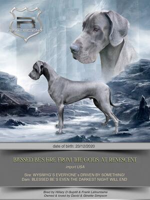 - Blessed Be's Fire From The Gods at Renescent (Imp Usa) x Danemoor Clear Blue Morning