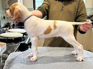 Chia joined us at Ladyhawke in 2020. Andy had wanted an orange and white Pointer for about 15 years and we are grateful to Jayne and Steve Harrison at Millpoint HQ for entrusting her to us. A new breed for us having had HPRs for many years. Chia is a beautiful soul she has a lovely temperament and loves people. She is regularly placed at Championship and Open Shows and has gained her stud book number. However, first and foremost she is a much loved family pet.