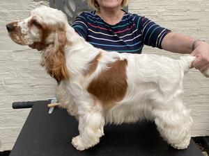 Elsa has been lightly shown due to immaturity and lots of coat to strip out. She has such an outgoing personality and fly's around the ring with attitude. A well balanced little girl with correct set ever wagging tail. She is a dream to show.
