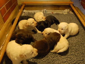 This is our 6th generation and BB's first litter. We are very pleased with them. 3 of the 4 grandparents are Champions and their father has his Junior Warrant. It is a tricolour litter and all the puppies are currently being raised in the kitchen with the family, being well socialized and are happy and contented. We live on a farm with a river running through it which is heaven for Labs. They ride out with our horses and live in the house with us. Our dogs are pets although bred for the show ring. BB (Habibti) has happily retrieved the odd rabbit in the past when my sons have taken her shooting.