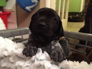 The litter comprises strong, healthy puppies - both Black and white and liver and white, with dew claws removed, but tails left as nature intended them. The puppies are lavishly reared in a family home and both their mother and maternal grandmother can be seen. The sire is Wildbach Black Adder, whose son was the World and European Cani-X Champion dog 2013. Ruby's sire, Sh Ch Kilnrae Maverick was BOB at Crufts 2004 and his grandmother, Sh Ch Jennaline Kentish Krumpet was twice BOB at Crufts. Both parents have excellent low hip scores and clear eye certificates. The pups are Kennel Club registered and have a low inbreeding co-efficient, i.e. 2.7% against the GSP breed average of 6.3%.