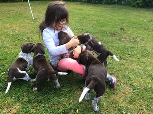 These puppies have not been docked due to the outstanding protentional for the show ring however, on the mothers side she has been awarded several times novice, all age and open field trail awards. Her father has won HPR points trophy, Hampshire gun dog and 4th at the HPR Championships this year amongst many awards in open and all age during his career as HPR field trail dog. The Sir of the puppies is an international show champion NL, Champion LUX, Bel Show Champion, also, an open field trail dog qualifying for the HPR championships this year. If your able to offer an exceptional home for a puppy please contact Gill .