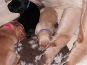 This is Willow's second litter . She is a beautifully tempered bitch who loves being around people, especially children and often visits a local playgroup. Willow is a much loved pet and the puppies will be raised in our family home along with our three other Labradors. Willow was mated with George (Willowcreek Swift) a black lab who is a calm, handsome and very intelligent dog.