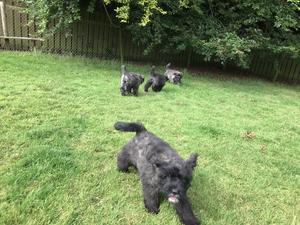 We are Kennel Club Assured Breeders, and are proud to have been fully inspected and approved. Our ambition is to produce happy, healthy, sane and breed typical Bouviers for ourselves to show and we occasionally have a special puppy available to a special home. We observe considerable health testing and are especially proud to be part of the PupScan Project. This means our puppies are bred from generations of health tested parentage, recieve a full veterinary health check and are also Ultrasound Scanned by an orthopaedic Surgeon for normal joint development before leaving us. This has allowed us to assess bone development and pin point an optimum safe time for our puppies to join their new owners, specifically when their fragile immature joints have achieved sufficient bone development for them to safely withstand the demands of family life. An additional benefit to this has been that our puppies leave with their full vaccination course completed, they are independant, have begun their socialisation and are ready to meet the world. Their new owners can immediately attend training classes and introduce their new family member instead of the previous difficulties of keeping a very young Puppy confined to home for a month whilst waiting for vaccinations.