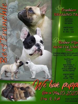 We have to offer you french bulldog bitch BestFrenchie Matylda, brindle colour. Born in small house kennel named BestFrenchie on 10th May 2020, so she is ready to go to New home. Our dogs are members of our family , they live with us in the house. Matylda has been health checked and she has health certificate. We put our best for the growth and health of our puppies. We take care of the socialisation of the puppies and about feeding them with whats the best. The puppies are eating hight class foods with a lot of meat in it and also on raw meat with vegetables. Its really important to us to be in contact with the new owner, we always will be more then happy to help. We care alot about health so all our bitches and dog are health checked and we only use health check stud dogs.