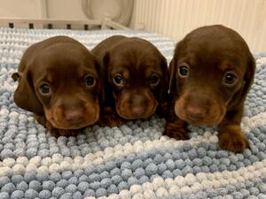 Our beautiful Dottie has had a litter of three gorgeous, healthy chocolate and tan smooth haired Miniature Dachshund puppies. They have been raised in a family home and are very used to being handled (especially by children)! They are comfortable with all the usual sounds of a busy household.
