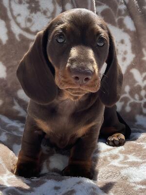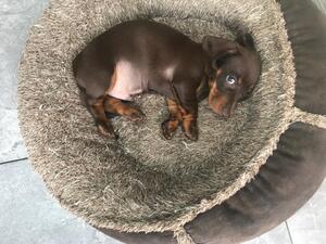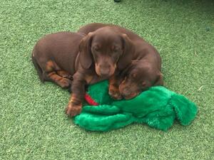 Our beautiful Dora and handsome boy Hendricks have had a litter of 5 gorgeous, healthy chocolate and tan smooth haired miniature dachshund puppies. They have been lovingly raised in a family home and are very used to being handled. The pups are comfortable with all the usual sounds of a busy home.