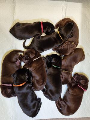 This fantastic litter includes a mixture of boys and girls, of black and also the sought-after liver coloured puppies. They will grow up to become highly intelligent, gentle, loyal and energetic dogs - perfect for an active family. They are being reared in bespoke facilities in the warmth of our family home, handled on a daily basis with a programme of socialisation, and are accustomed to children, other animals and household noises. They are KC registered with a five generation pedigree plus original certificate and paperwork. Each puppy is undergoing a programme of worming and will be veterinary health checked with a certificate. They will be microchipped, and come with an extensive puppy pack, including food, a toy, smelly blanket, a training guide, book and several weeks' free insurance. The inbreeding coefficient of this litter is the lowest I’ve ever seen at 0.2%