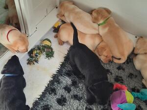 Our labrador puppies are well socialised before leaving here to go their new homes with children and our other dogs. Each labrador puppy has their own personalised 'puppy pack' to take with them consisting of a starter pack of puppy food, a comprehensive pamphlet containing: Family photos, Pedigree, Kennel Club Registration Certificate, Microchip Certificate, Helpful hints on how to raise your labrador puppy, Socialisation, Exercise, Kennel Club Good Citizen dog Training Scheme, a list of Training Clubs in your area and detailing diet, training, worming and immunisation, etc. Copies of parents relevant Hip, Elbow, Eye and DNA Certificates. 4 weeks insurance and a Sales contract, etc.