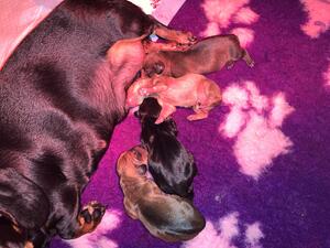 4 pups born 29/11/22. 1 boy 3 girls, boy shaded red, girls shaded red, red, and black & tan. All happy and healthy little pups. Mum and pups doing very well.