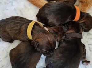 Our litter are raised within our family home which meets the standards expected by The KC Assured Breeders Scheme. We have just 1 boy and 1 girl remaining from our beautiful litter. All our puppies will be KC registered, received their 1st vaccine of Nobivac 4, be flea, tick and worm treated according to guidelines, and will leave for their forever homes with a bag of their weaned puppy food and a bundle of goodies. Viewing will be allowed at 3 weeks old when a holding deposit of £300 will be taken.