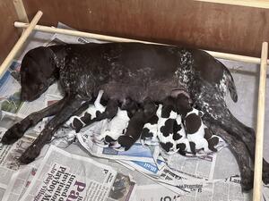 Puppies born 02/09/2023. Bron and Speedy have produced a strong litter of 8 German Shorthaired Pointer puppies after a successful mating (AI).