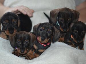 Both parents are here to meet, both KC registered, coming from champion lines and health tested. Mother is my miniature wire haired dachshund girl, wild boar colour. Dad is my miniature wire haired dachshund boy, black & tan colour.