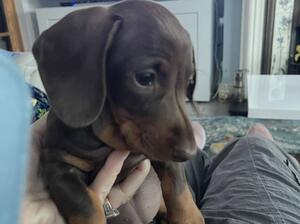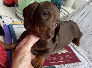 Our handsome , chocolate dapple boy and chocolate and tan girl have had a beautiful chocolate and tan girl puppy . She is READY NOW to go to her forever , caring , loving ,home, She is an outstanding pup with a full 5 generation pedigree , Her parents are both family pets and can be seen with her. .She will be KC registered, microchipped and vaccinated . She is a healthy, well socialised pup ,who has been brought up in our family home, getting used to noises and being handled by our 4 grandaughters . She really is an outstanding example of her breed .