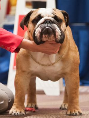 Critique - "Looks juvenile, wide skull, the wrinkle on the nose could be a little smaller but still acceptabe, nice round dark eyes, excellent front, good movement, must still develop"