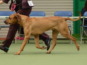 1 Hicks' Ch Nuthouse Manhatton (Rhodesian Ridgeback). This dog was not showing his age at all, is of correct shape and moved extremely well with ease around the ring, in excellent coat and muscular condition, could easily do the job he was intended for. Best Veteran in Show.