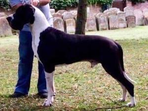 17 month well marked mantle who belies his age and easily held his own in this class. Good head with parallel planes. Lovely dark eyes and excellent dentition. Arched, clean neck into well laid shoulders to an ample, flat boned front with good pasterns and knuckled feet. Good wither and flat, firm topline held on the move. Nice depth of well sprung brisket. Lovely muscled rear quarters. Nice bend of stifle with hocks let down. Moved with the reach and drive this breed should have to work.
