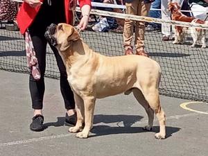 Judges critique - 3 1/2 year old fawn dog. Balanced throughout, Masculine head, good front and rear, moved with drive, excellent topline.
