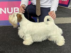19 months old female. Excellent size and type. Typical feminine head. Correct bite. Good lenght o neck. Exc. topline and underline. Exc. tailset and carriage. Exc. lenght of body. Good coat quality. Slightly narrow movement behind.
